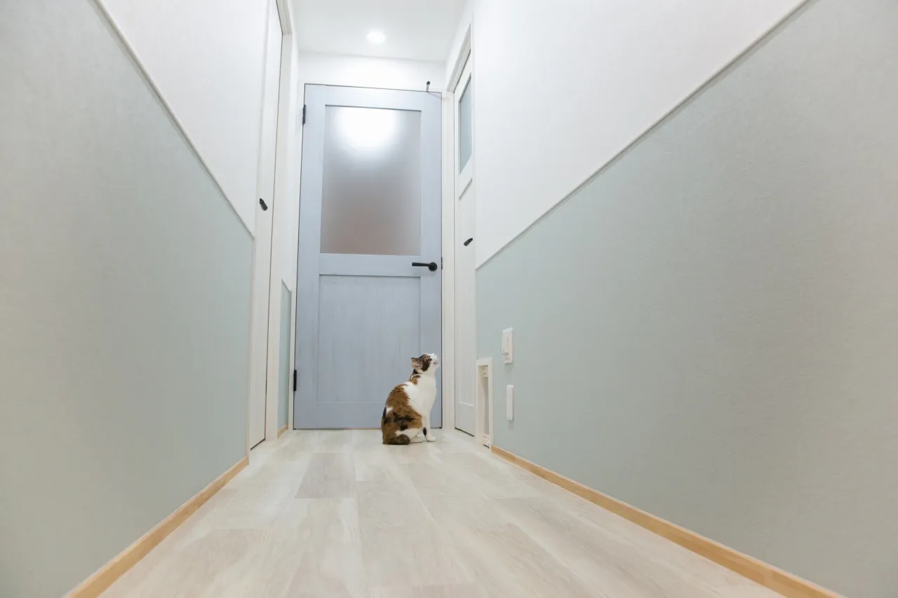 玄関ドアを開けた際に猫が飛び出して行かないよう、セーフティネットとしての脱走防止戸を設計の中に組み込んでいます。