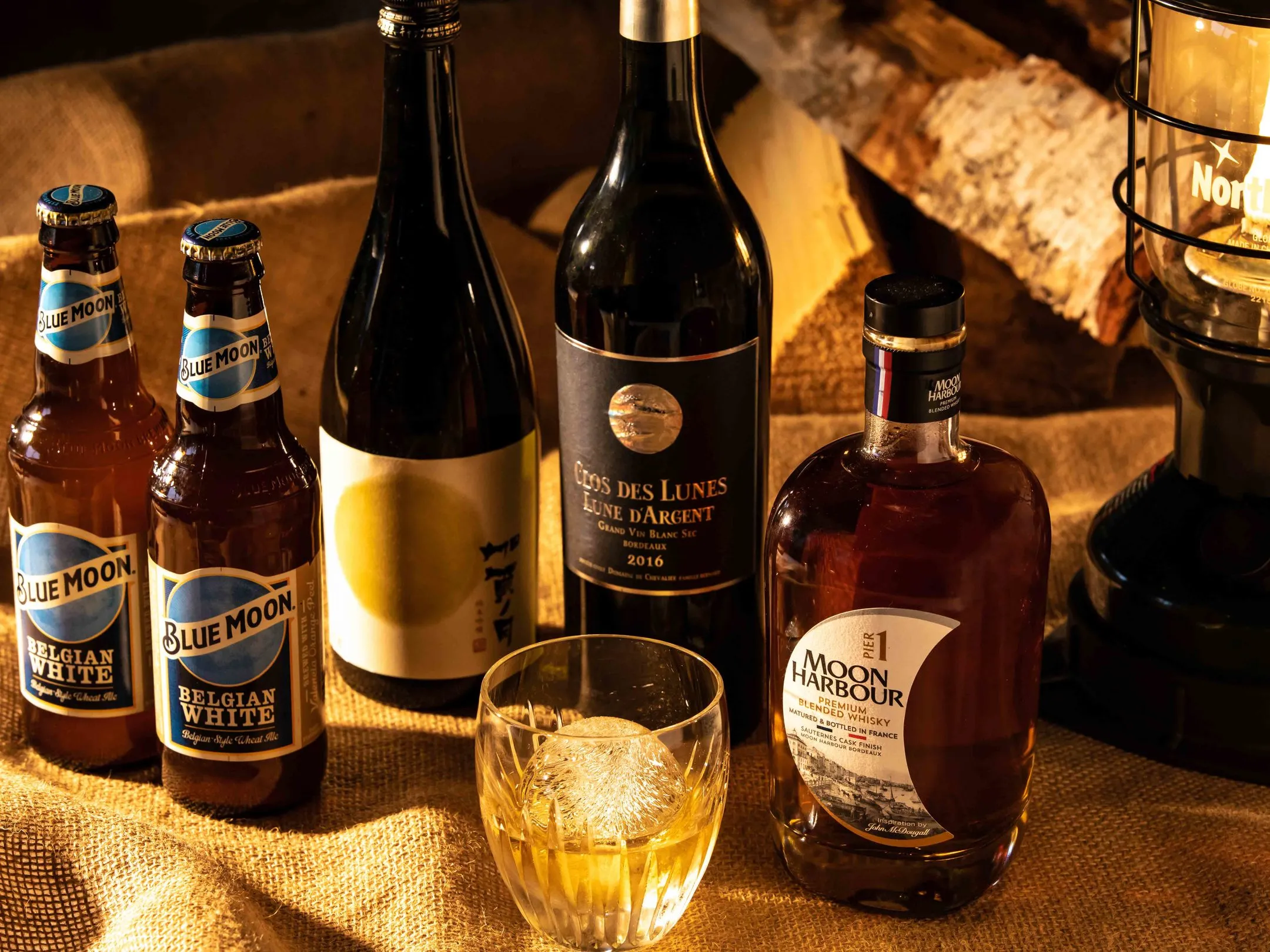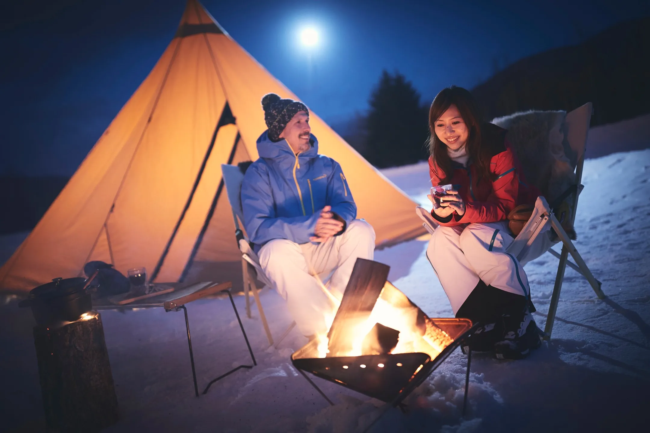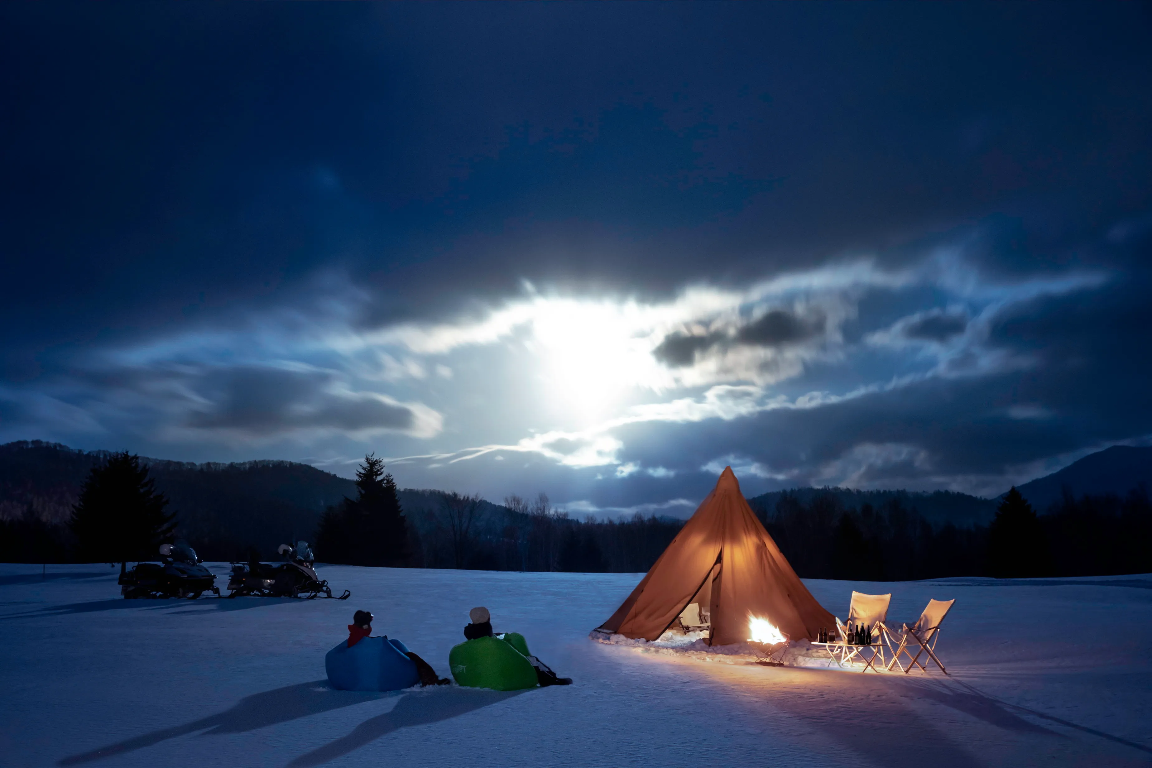 ツアーの途中には「お月見ベース」という、テントや焚き火が用意された場所があります。今回からは、雪上でゆったりくつろげるお月見の観賞席も加わりました。さらにここには、「ムーンハーバー」というウイスキーや「満月」という日本酒など、名前が月にちなんだお酒が用意されています。雪原の上の特別な観賞席に座り、月明かりを浴びながらお酒を堪能することは贅沢な体験です。