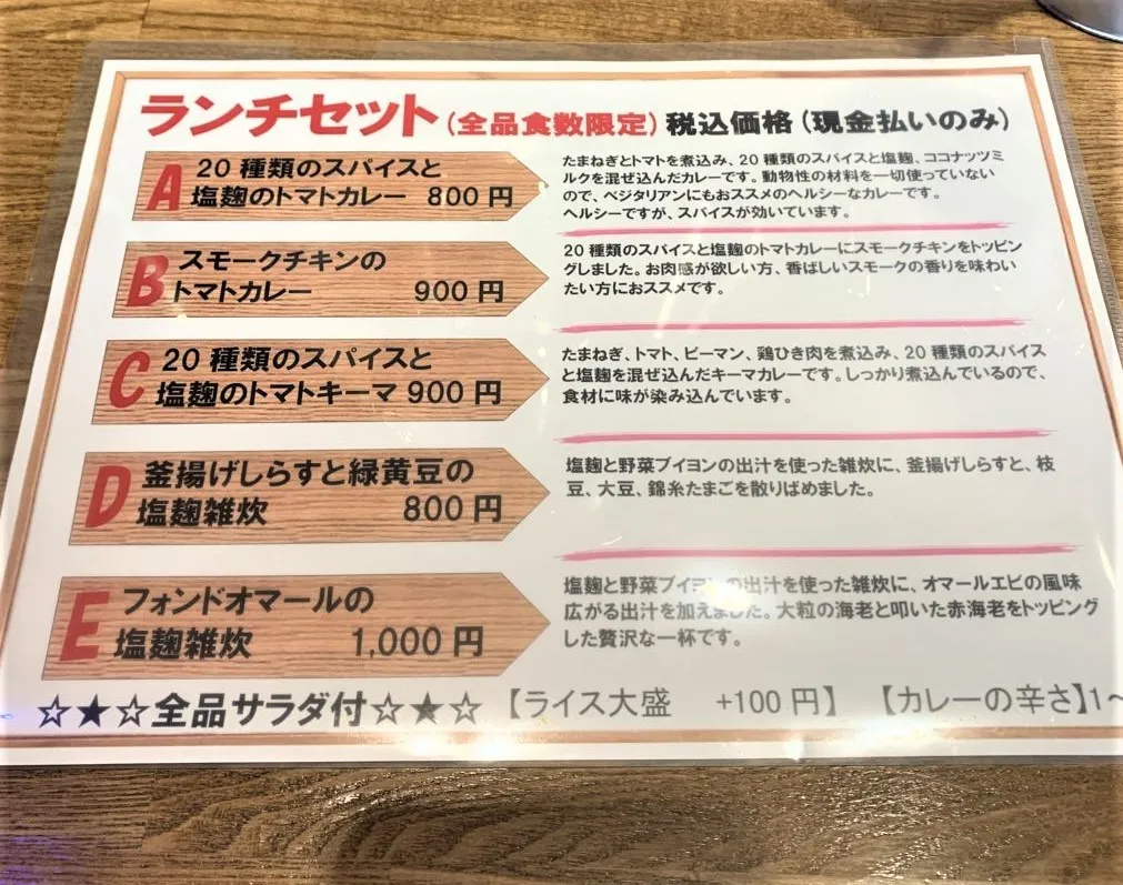 バングラデシュとのパイプの強い貿易商でもある常盤氏が集めた20種類のスパイスと塩麹、ココナッツミルクを混ぜ込んだトマトカレーは動物性の材料を一切使用していないにもかかわらず、塩麹とスパイスの作用でコクと旨味が強調されて何度でも食べたくなる味に仕上がっております。