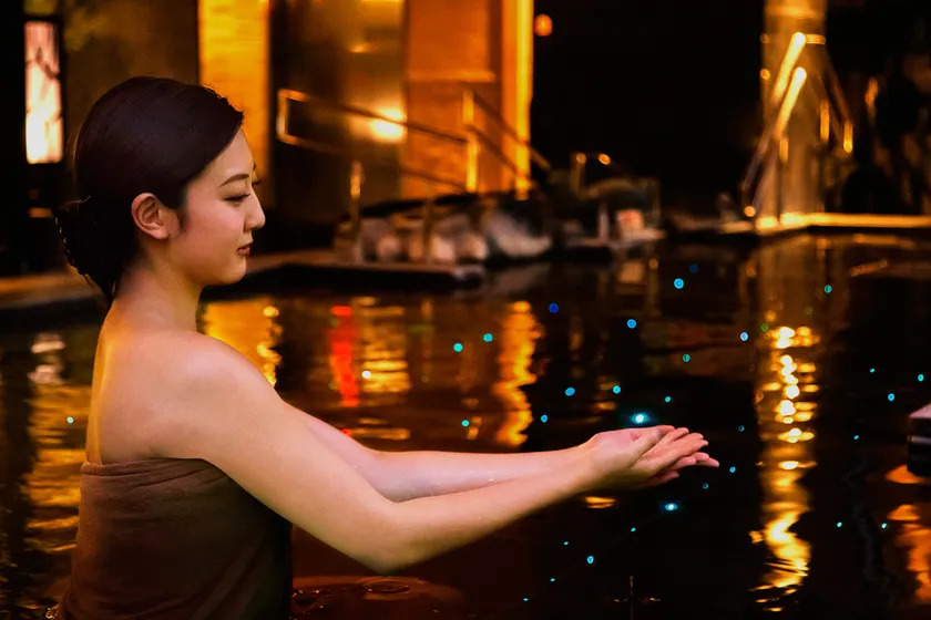 7色の光が幻想的な雰囲気を醸し出す「ほたるの炭酸泉」をはじめとする4つの炭酸泉や話題のプロジェクションマッピングを搭載した岩盤浴など、アロマが漂う7種類の岩盤浴が楽しめます。今年は岩盤浴が有名な人気ドラマのロケ地にもなったほか、様々な世代に愛されている日帰り温浴施設です。