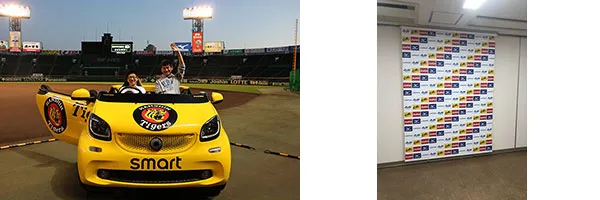 ・1塁ベンチ前には、インタビューボード、お立ち台、リリーフカーを準備します。夜の球場の雰囲気を楽しみながら記念撮影を行うことができます。