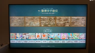 タブレットを使った操作で、国宝「聖徳太子絵伝」の見たい部分を拡大したり、聖徳太子の生涯の物語から該当する場面を呼び出したりすることができるアプリケーションです。1面およそ縦2m×横1.5mの国宝絵伝を、計28区画に分割して撮影し、画像をつなぎ合わせて1面で18億画素の高精細画像データを作成しました。2面で36億画素という高精細画像データがリアルタイムで処理され、大型8Kモニターに高精細画質で映し出されることで、作品の細部までじっくり鑑賞することができます。このアプリケーションは、日本語・英語に対応しています。