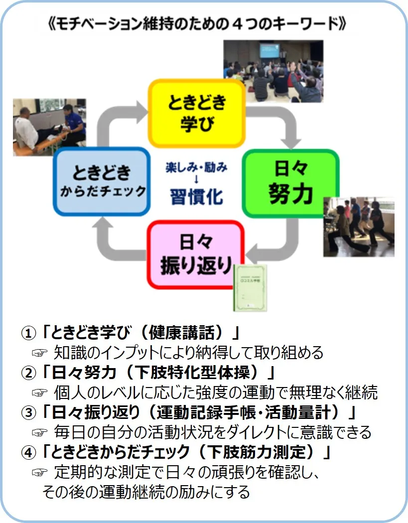 同教室では整形外科医監修の強度別体操プログラムを採用し、毎月の教室で下肢筋力測定を行い、その結果に応じた強度の体操を毎回指導するというもので、指導の際には、正しいフォームや注意点などの伝達を行いました。