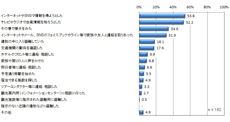 ・台風接近時の行動は、「インターネットやSNSで情報を得ようとした」が53.8%、「テレビやラジオで台風情報を知ろうとした」が52.2%と情報収集が上位を占めた。他にも「その場で様子をみた」が34.6%、「インターネットやメール、SNSのフェイスブックやライン等で家族や友人と連絡を取りあった」が31.9%などあがっている。