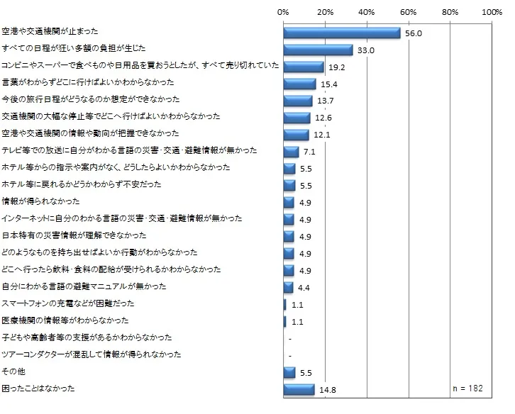 ・台風発生時に困ったことは「空港や交通機関が止まった」が56.0%と最も高かった。また、「すべての日程が狂い多額の負担が生じた」「今後の旅行日程がどうなるのか想定ができなかった」などの日程に関する不安や、「コンビニやスーパーで食べものや日用品を買おうとしたが、すべて売り切れていた」「言葉がわからずどこに行けばよいかわからなかった」など台風発生前や発生時の行動についても影響を受けていることがみられる。