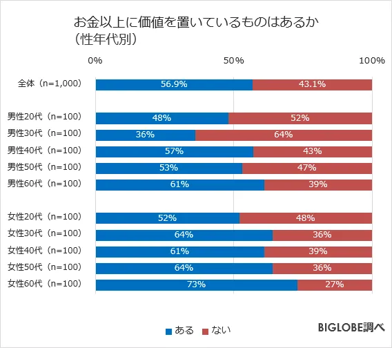 20代から60代の男女1,000人に「お金以上に価値を置いているものはあるか」を質問したところ、「ある」と回答した人が56.9%に。また、性別で見ると、男性は51%、女性は62.8%が、お金以上に価値を置いているものがあると回答した。