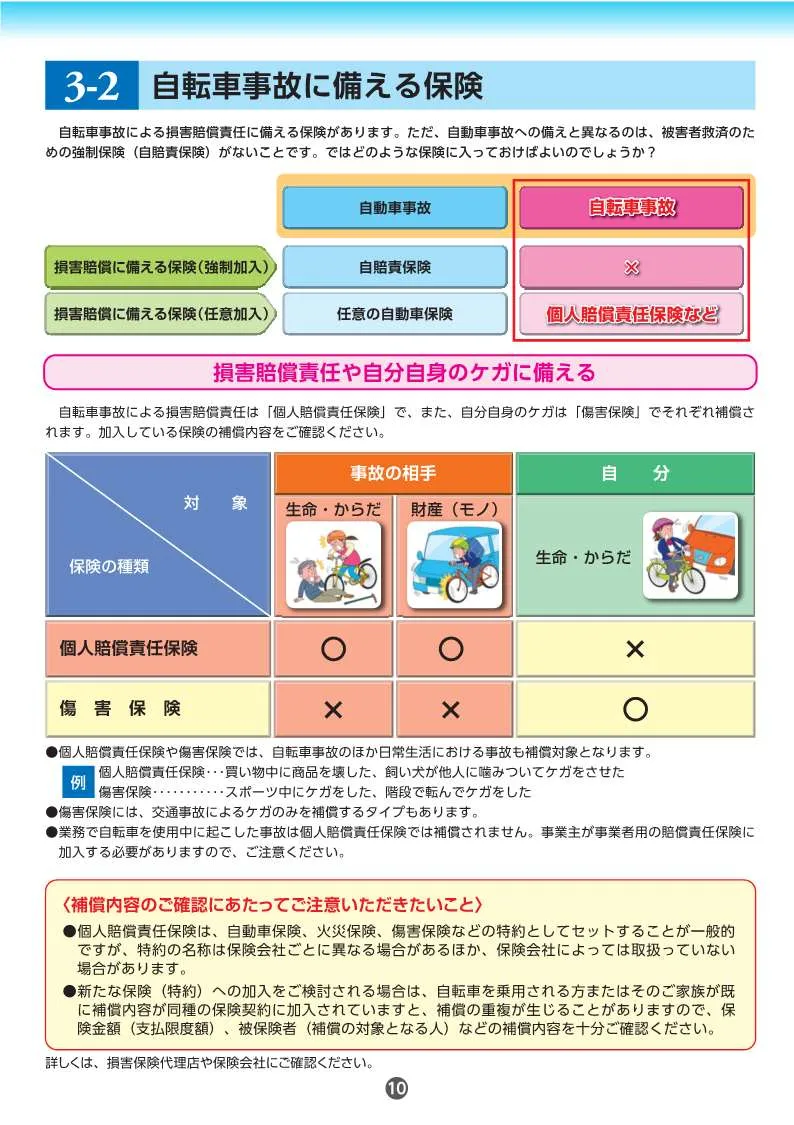・本冊子は、自転車事故の特徴、交通ルール・交通マナー、自転車による加害事故例、自転車損害賠償保険等をまとめています。