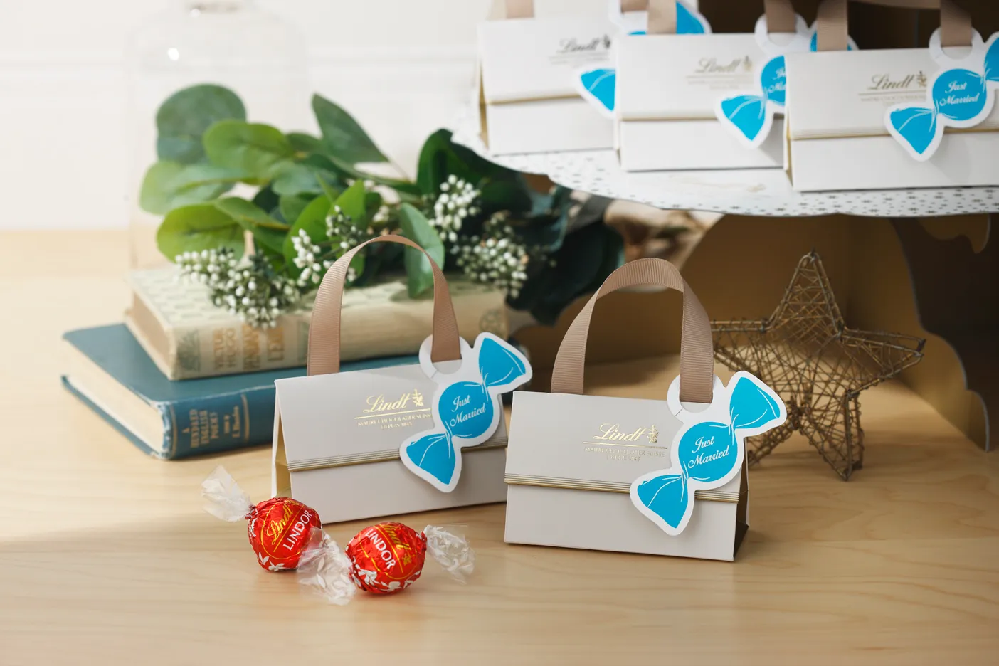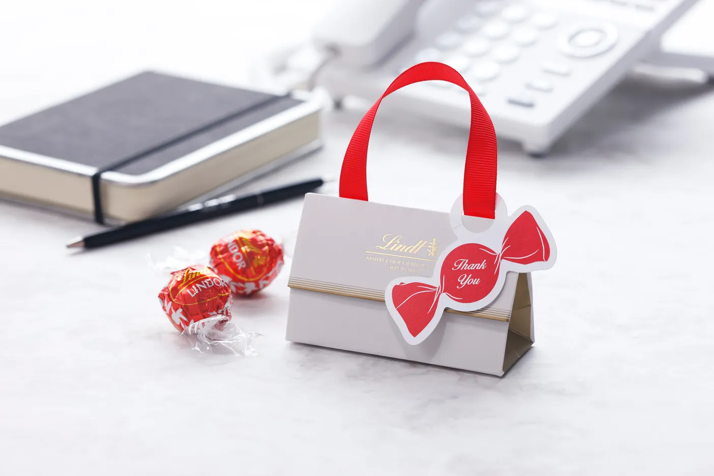 ウェディングをはじめ、異動・退職・産休・引越しなど、人生の節目を迎えるライフイベントの多様なシーンで、お礼やご挨拶に贈るチョコレートギフトとしてお役立ていただける「プチギフト リンドール」。どなたにも喜んでいただける、リンツ一番人気のチョコレート「リンドール ミルク」2個を可愛らしい手のひらサイズの、ロゴをあしらったシンプルなデザインのミニバッグに詰め合わせています。
