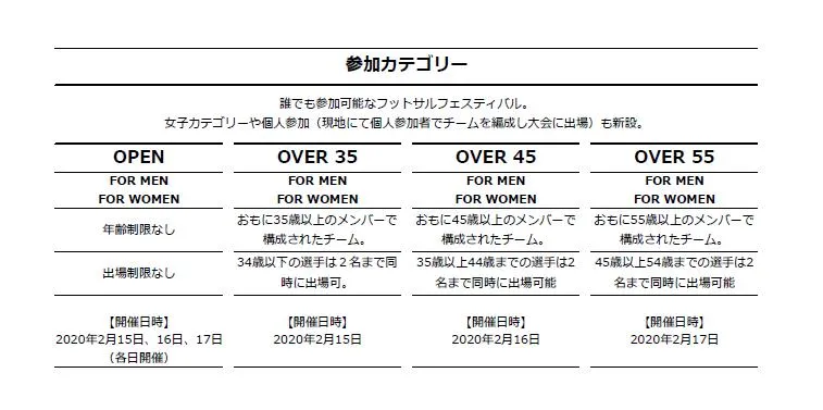 卒業旅行や社員旅行などで5名以上の仲間が集まれば、チームでの参加が可能。仲間と一緒にハワイ旅行もフットサルも楽しめる、いつもとは違った最高の思い出を作ることができます。また、チームでの参加が難しい場合も、「個サル」形式にて大会側でチーム編成を行う為、友人や家族とともに、またおひとり様でもご参加いただけます。参加カテゴリーは、12歳以上なら年齢関係なくエントリーできるオープンカテゴリーのほか、年齢別(35歳以上、45歳以上、55歳以上)カテゴリーが用意され、今大会よりそれぞれの女子カテゴリーも新設されました。参加のお申込みは、公式サイト https://www.hfic.jp にて2020年1月20日まで受付中です。