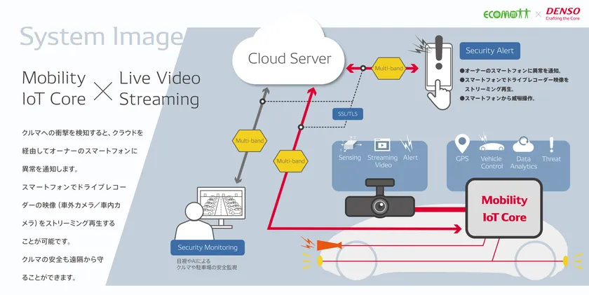 エコモットは、「リモートセキュリティ」に関するデモンストレーション展示において、LTE対応高性能テレマティクス端末「HDL-900」のリアルタイムストリーミング技術等技術協力いたします。本デモンストレーションでは、車両への衝撃を「Mobility IoT Core」に接続されたセンサーが検出し、オーナーのスマートフォンにアラートを送ると同時に、ドライブレコーダーのカメラ(車内/車外)映像をストリーミングで確認することができます。さらに、ストリーミング映像により車両への衝撃が不審者によるものである場合は、スマートフォンの操作によりクラクションを鳴らす、ライトを点滅させる等の威嚇をすることが可能です。