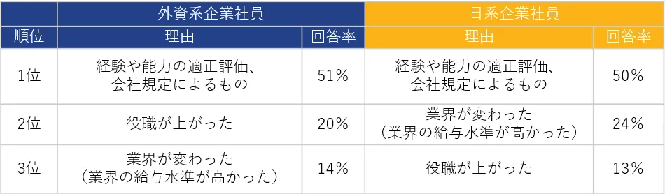 外資系・日系企業社員ともに、年収が上がった理由の第1位は「経験や能力の適正評価、会社規定によるもの」でした。(外資系企業社員:51%、日系企業社員:50%)。第2位、第3位は「役職が上がった」(同:20%、13%)、「業界が変わった(業界の給与水準が高かった)」(同:14%、24%)でした。