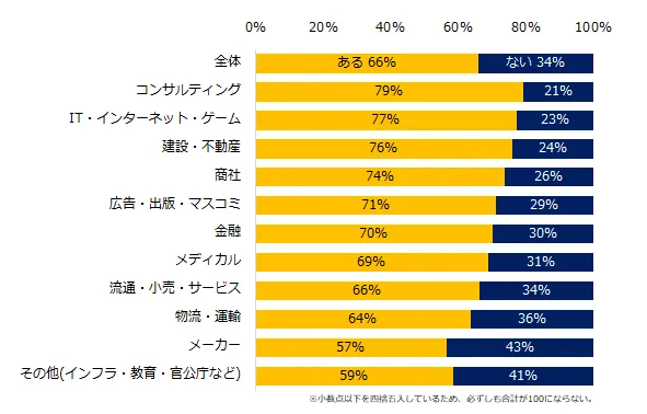 「これまでに友人・知人から『自社に来ないか?』と誘われたことはありますか?」と伺うと、66%が「ある」と回答。年収別でみると、年収1000万円以上は72%が「ある」と回答しています。業種別で「ある」と回答した方が多かったのは、「コンサルティング」(79%)、「IT・インターネット・ゲーム」(77%)、「建設・不動産」(76%)でした。