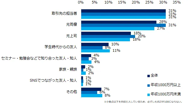 リファラル(社員紹介)転職を勧めてきた友人・知人との関係性を伺うと、最も多いのは「取引先の担当者」(31%)、次いで「元同僚」(28%)、「元上司」(18%)が続きます。年収別でみると、年収1000万円以上は年収1000万円未満に比べ「元同僚」(年収1000万円以上:31%、年収1000万円未満:27%)が目立ちました。