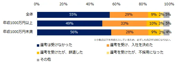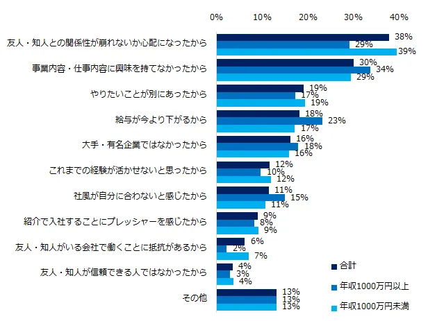 年収別にみると、年収1000万円以上は年収1000万円未満に比べ、「事業内容・仕事内容に興味を持てなかったから」(年収1000万円以上:34%、年収1000万円未満:29%)、「給与が今より下がるから」(同:23%、17%)が目立ちました。年収1000万円未満は友人・知人との関係性を心配する方が多いようです。