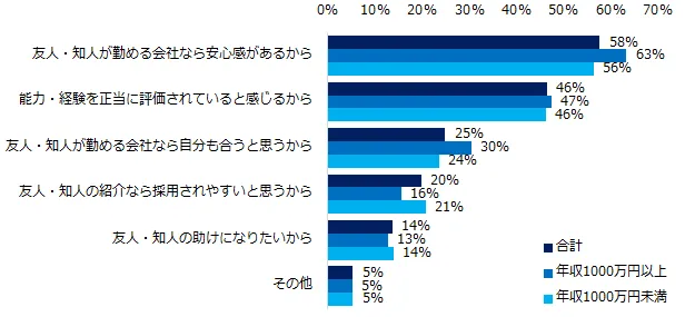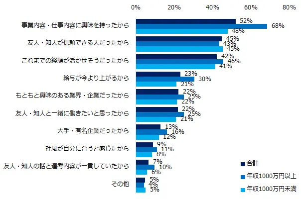 一方、リファラル(社員紹介)転職で入社を決めた方に理由を伺うと、トップ3は「事業内容・仕事内容に興味を持ったから」(52%)、「友人・知人が信頼できる人だったから」(45%)、「これまでの経験が活かせそうだったから」(42%)でした。年収別にみると、年収1000万円以上は事業内容・仕事内容への関心が社員紹介からの入社につながっているようです。
