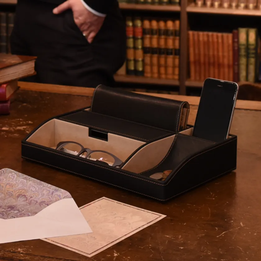 オーバーナイターとは携帯電話、時計、メガネ、鍵、小銭など普段使いの小物を一晩(オーバーナイト)あずかってくれる便利な収納ケースです。機能的に収納できるので、忙しい朝に探す手間がはぶけて重宝します。デスクで使用できるコンパクトな小物収納です。お手持ちの小物をお好みの位置に収納できます。書斎やオフィス、玄関に一つあると重宝するのがこんな収納アイテム。