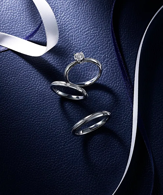 まとう女性の仕草までも美しくする、幸福感にあふれたマリッジリング。王冠の縁取りを模したミル打ちのドットと、3石の端正なダイヤモンドがきらめきのコントラストを奏でます。華奢なダイヤモンドにさえ凛とした輝きを秘めるのは、「ロイヤル」の称号を授与された名門ダイヤモンドジュエラーたる証。愛し合う二人の絆として、生涯を共にするノーブルなリングは時を超え、未来を輝かせるはず。