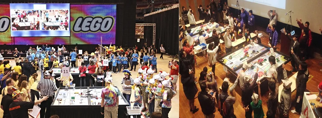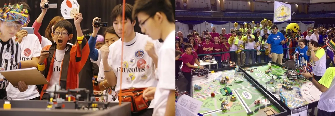 9 歳~16 歳の青少年を対象とした世界最大規模の国際的なロボットコンテストです。競技は自律型ロボットで 2分30 秒の間にミッションの攻略を目指す『ロボットゲーム』と、「プロジェクト」「ロボットデザイン」「コア・バリュー」の 3分野『プレゼンテーション』で競い合います。