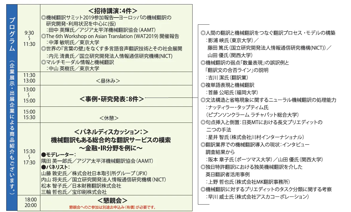 本イベントは、一般社団法人日本翻訳連盟、一般社団法人人工知能学会が協賛、一般社団法人言語処理学会が後援し、公募セッションをはじめ、国際的な機械翻訳に関する学会「機械翻訳サミット」およびアジアでの機械翻訳に関するワークショップの報告や、多言語音声翻訳・マルチモーダル翻訳に関する最新技術の紹介を行います。また、日本取引所グループ、NICTの技術者、開示文書の翻訳を行う翻訳会社が参加し、金融・IR翻訳での機械翻訳の導入についてのパネルディスカッションを行います。さらに機械翻訳に関する企業展示を併設します。
