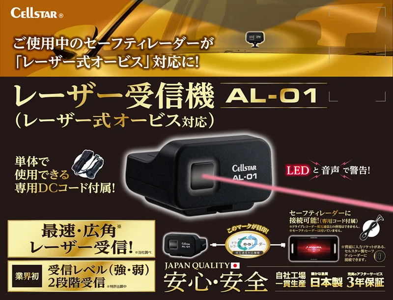 自動車関連エレクトロニクス製品の開発・製造・販売を主業務とするセルスター工業株式会社(本社:神奈川県大和市、代表取締役社長:勝永 直隆)は、レーザー式オービスに対応したレーザー受信機「AL-01」を10月下旬に発売いたします。