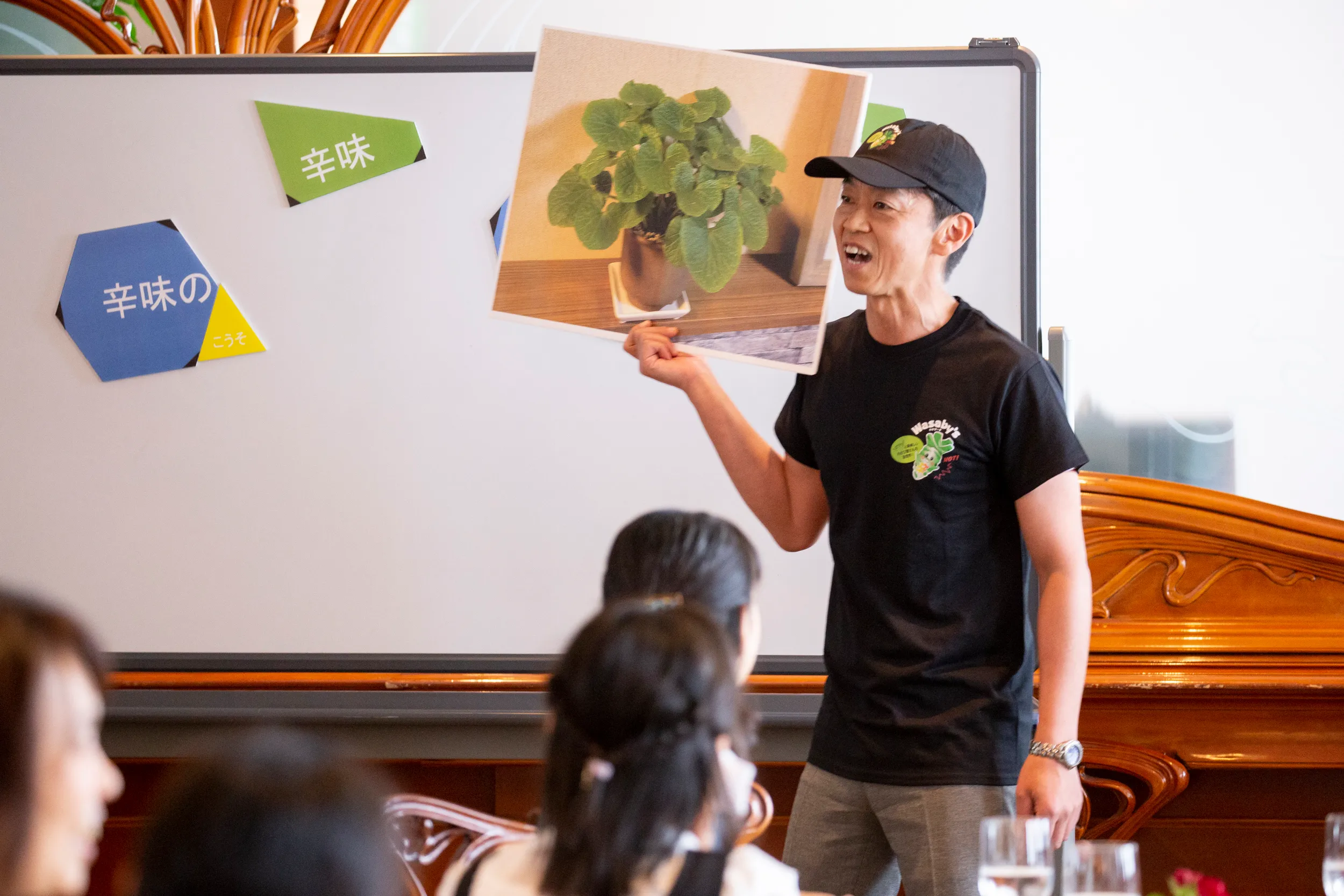「味覚の授業」では、味覚の基本とされる5味(甘味・塩味・酸味・苦味・旨味)の大切さを、三國シェフによる体験型の授業で学んでいただき、改めて“味”に対する意識を高めていただきました。「わさびのすりおろし体験」では、わさびの特徴についてご説明させていただきながら、実際に伊豆産「本わさび」を鮫皮おろしでおろしていただき、「本わさび」の香りや辛み、おいしさを体験していただきました。
