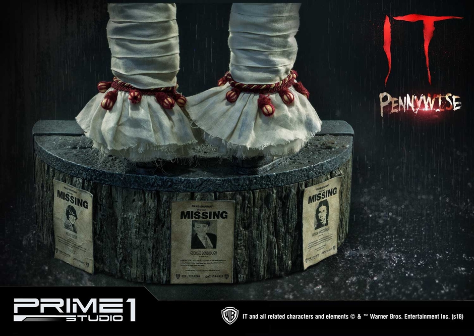 衣装はリアルな布製、印象的な道化衣装を見事に再現。毛髪は人工毛仕様で、今まさにそこにいるかのような仕上がりとなっています。頭部はもちろんプライム1スタジオが持つ最高峰の3D立体造形技術で再現いたしました。ベースは劇中のオープニング、河のように下水道へ流れ込む大量の雨水、折り紙の船と有名過ぎる下水口をデザイン。下水口から伸びる“あの腕”は“何か”物語るかの様。更にベース背面には行方不明となった子供の情報を求めるポスターなどホラーな雰囲気を盛り込んでおります。