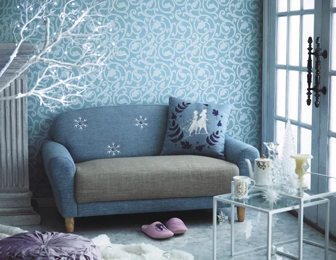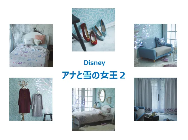 新アイテムは29種類で、エルサとアナをイメージしたカラーリングやモチーフを使用したロングコート、バレエシューズ、バッグなどのアパレル商材や、キャラクター達のシルエットやモチーフを多用したカーテン、ソファ、布団カバー等のインテリア用品、幻想的なインテリア小物から子ども服、そして学習用品まで、幅広いラインナップとなっています。