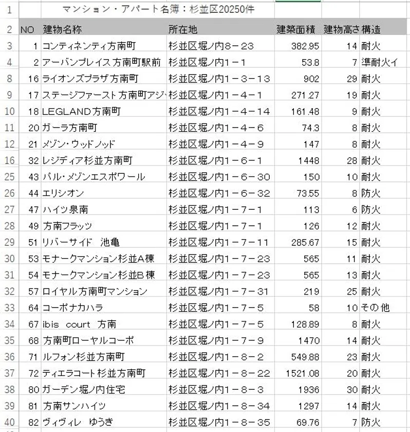 東京都杉並区のマンション・アパート名簿は20,250件ありますが、その一部サンプルを添付いたしますのでご覧下さい。