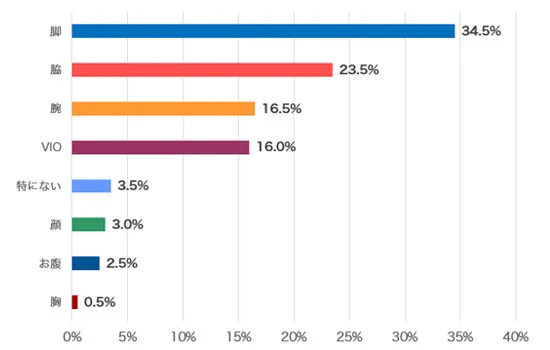 特に夏場になると出すことが多い「脚」「脇」「腕」の回答が7割以上を占めています。また、「VIO」のVラインも水着になる際に処理が必要になる部分です。
