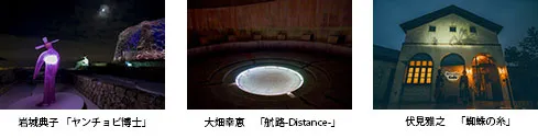 「自然体感展望台 六甲枝垂れ」では、岩城典子の「ヤンチョビ博士」および大畑幸恵の「航路-Distance-」を、また六甲ガーデンテラス内「見晴らしの塔」付近では、伏見雅之による「蜘蛛の糸」に加え、本展覧会のメインビジュアルである植松琢麿の「world tree ll」が鑑賞できます。1000万ドルの夜景とともに、昼間とは異なる表情を見せる作品をお楽しみいただけます。