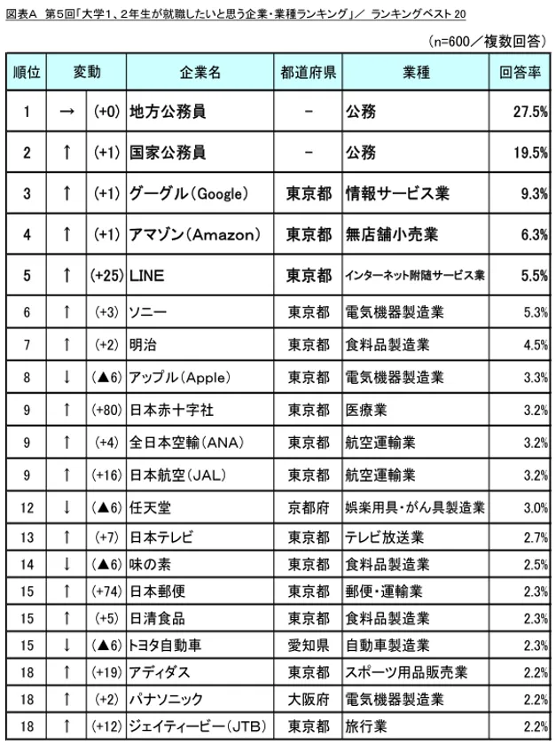 今回の調査では公務員の人気が再び高まり、1位と2位を独占しました。民間企業では3位「グーグル(Google)」、4位「アマゾン(Amazon)」に加えて、5位に「LINE」が新たにランクインし、学生が日頃からスマートフォン等でよく利用するIT関連企業の人気が上昇しました。