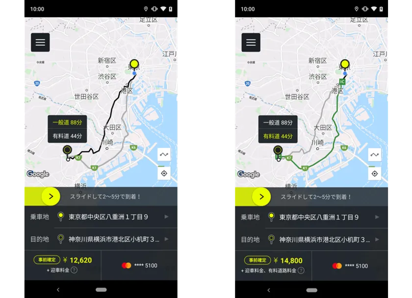 料金確認・配車画面例(左:一般道を選択した場合/右:有料道を選択した場合)