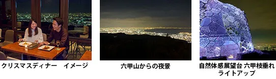 六甲ガーデンテラス内の「グラニットカフェ」では本格的なフレンチコースや、国産牛のローストビーフコースを、「六甲ビューパレス」ではシェフが目の前でメインのステーキを焼き上げる他、お子様でも楽しめるクリスマスプレートをご用意しています。六甲ケーブル六甲山上駅隣接の「TENRAN CAFE」ではシェフ特製の手作りスイーツも楽しめるステーキコースを提供します。またお食事だけでなく、六甲ガーデンテラスではプレゼントに最適な雑貨やお土産品などのお買い物もお楽しみいただけます。ショップ「ホルティ」では、クリスマス期間中人気のシルバーアクセサリー手作り体験を実施しており、二人だけの想い出を形にできます。更に夜には「自然体感展望台 六甲枝垂れ」や「見晴らしの塔」を華やかにライトアップします。天候によっては市街地では珍しい雪景色をご覧いただけ、非日常的でロマンチックな空間が広がります。