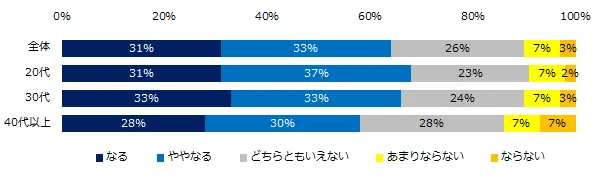 「転勤は退職を考えるキッカケになりますか?」と伺ったところ、64%が「なる」(なる:31%、ややなる:33%)と回答しました。年代別にみると、若手になるにつれ影響度が大きいようです。男女別にみると、男性より女性がキッカケになることが分かりました。