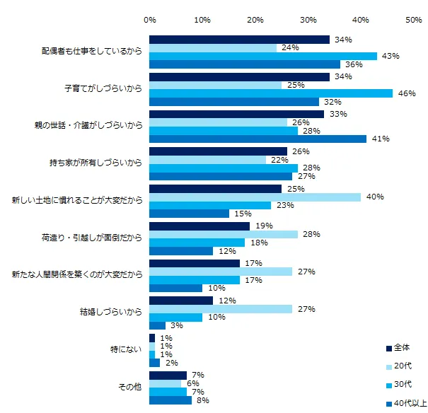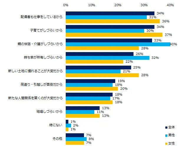 「条件に関係なく転勤を拒否する」と回答した方に、理由を伺うと、トップ3は「配偶者も仕事をしているから」(34%)、「子育てがしづらいから」(34%)、「親の世話・介護がしづらいから」(33%)でした。年代別にみると、20代は「新しい土地に慣れることが大変だから」(40%)、30代は「子育てがしづらいから」(46%)、40代以上は「親の世話・介護がしづらいから」(41%)がそれぞれ最多でした。年代が上がるにあたり、子育てや親の介護など家庭環境も大いに影響するようです。男女別で結果をみたところ、男性は「親の世話・介護がしづらいから」(40%)、女性は「子育てがしづらいから」(37%)がそれぞれ最多でした。