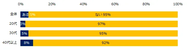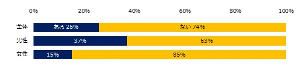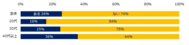 過去の転勤有無を聞くと、26%が「転勤したことがある」と回答しました。年代別では、20代16%、30代25%、40代36%、男女別では、転勤経験のある方は、男性37%、女性15%でした。