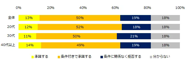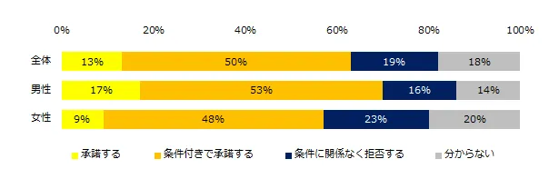 今後、転勤辞令が出た場合の対処法を伺ったところ、63%が「承諾する」(承諾する:13%、条件付きで承諾する:50%)と回答しました。男女別にみると、女性より男性が承諾する割合は高いようです。