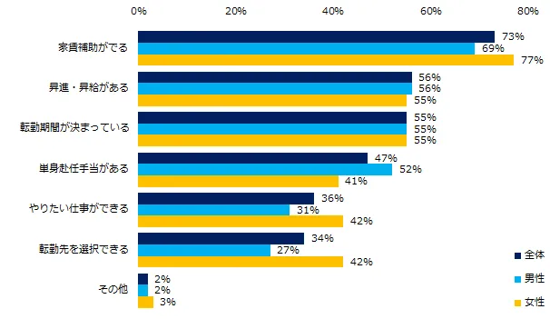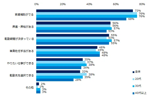 「条件付きで承諾する」と回答した方に、承諾条件を伺ったところ、トップ3は「家賃補助が出る」(73%)、「昇進・昇給がある」(56%)、「転勤期間が決まっている」(55%)でした。年代別で10ポイント以上差が出たのは「転勤先を選択できる」(20代:38%、30代:35%、40代以上:28%)、男女別で10ポイント以上差が出たのは「単身赴任手当がある」(男性:52%、女性:41%)、「やりたい仕事ができる」 (同:31%、42%)、 「転勤先を選択できる」 (同:27%、42%)でした。