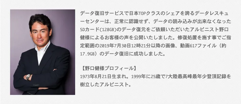 データレスキューセンター、 認識しないSDカードのデータ復元をご依頼いただいた アルピニスト 野口 健様によるお客様の声を公開