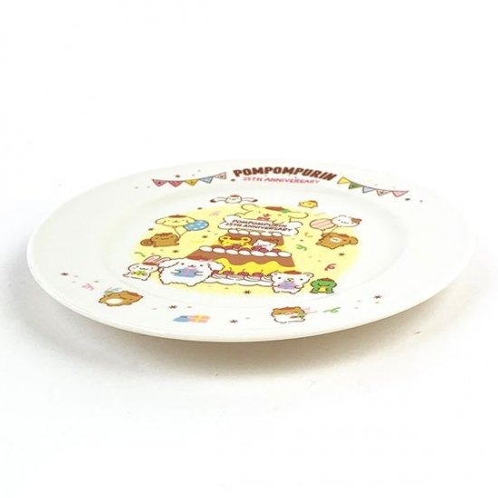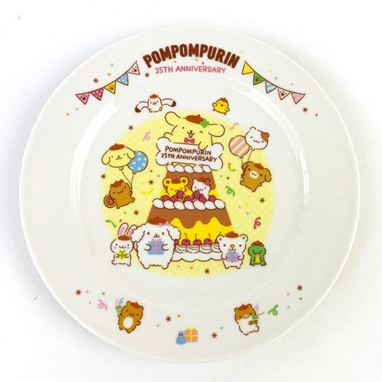 プレート全面に、ポムポムプリンを始めとするキャラクターたちが25周年をお祝いしている楽しいデザインが描かれています。