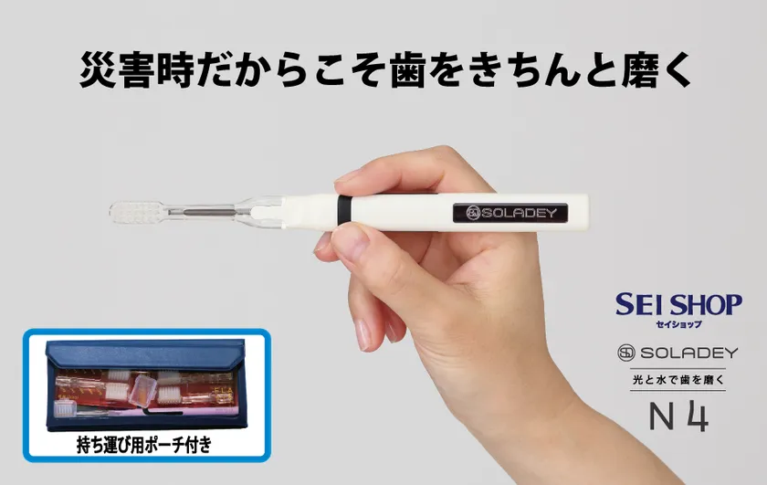 セイショップは、台風や地震後の避難所での口腔ケアに備え、 「災害時だからこそ歯をきちんと磨く」をコンセプトに、 避難所でも携帯できるポーチに光と 水で歯を磨くソラデーN4(シケン株式会社製造)を セットにした「ソラデー《サバイバルセット》」を発売