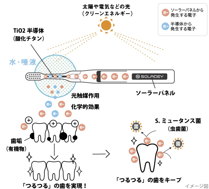 砂糖などはデンタルプラーク(細菌)によって乳酸に変わっていき、その乳酸が歯を溶かし始めます。 ソラデーはこの乳酸を経時的に分解します。