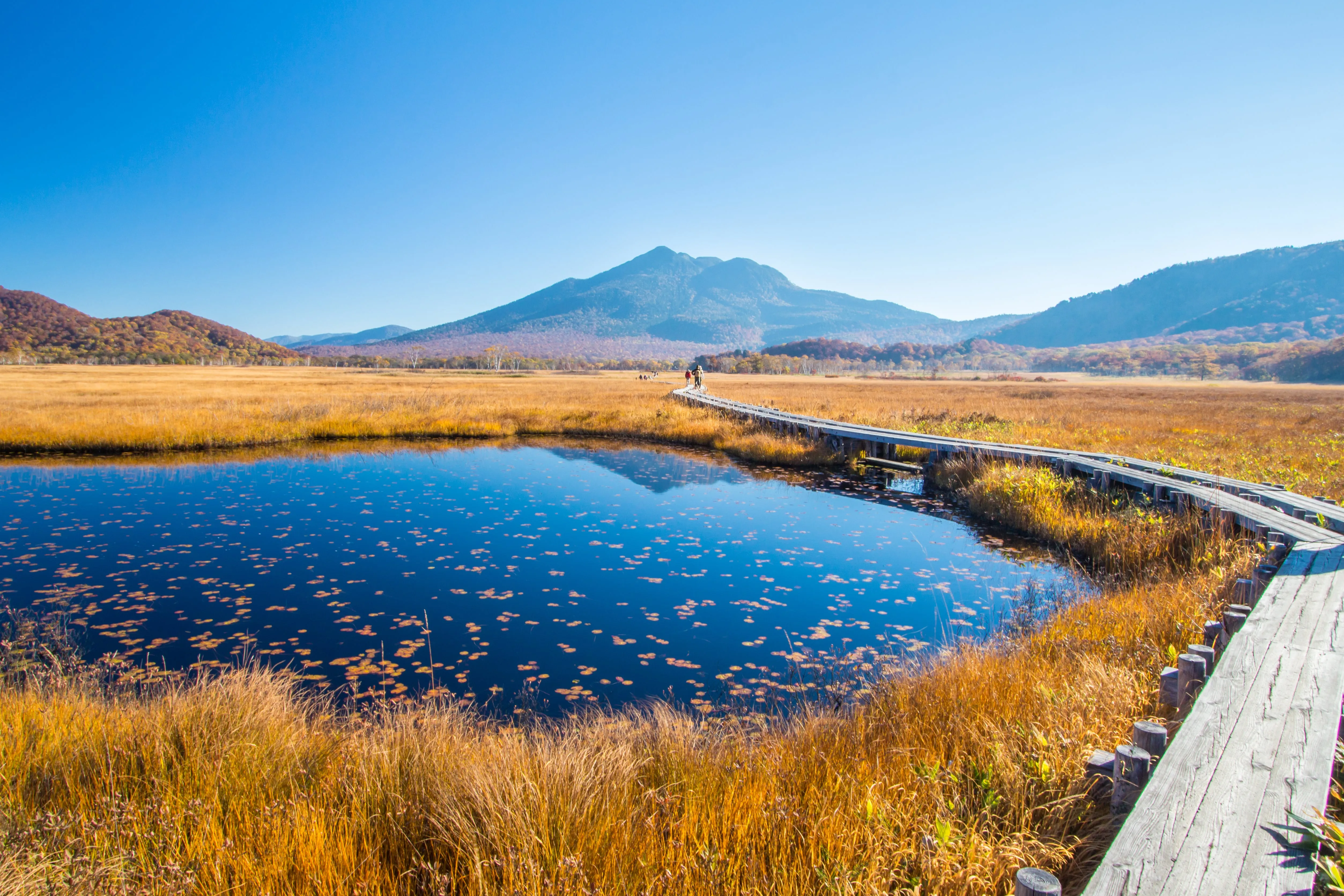 東京の北部、日光から西70kmに位置する尾瀬国立公園を抜けるハイキングコースは、のんびりと紅葉を楽しみたい方に最適です。山から草原、沼地に至るまで、さまざまな顔を持っています。片品村にある3つ星ホテルの尾瀬岩鞍リゾートホテルは、尾瀬特有の「草紅葉(くさもみじ)」と呼ばれる湿原の紅葉狩りに最高の拠点です。ハイキングコースを歩くと、金や赤に染まった葉が風にそよぎ、まるで海の上の木道を歩いている気分になるでしょう。