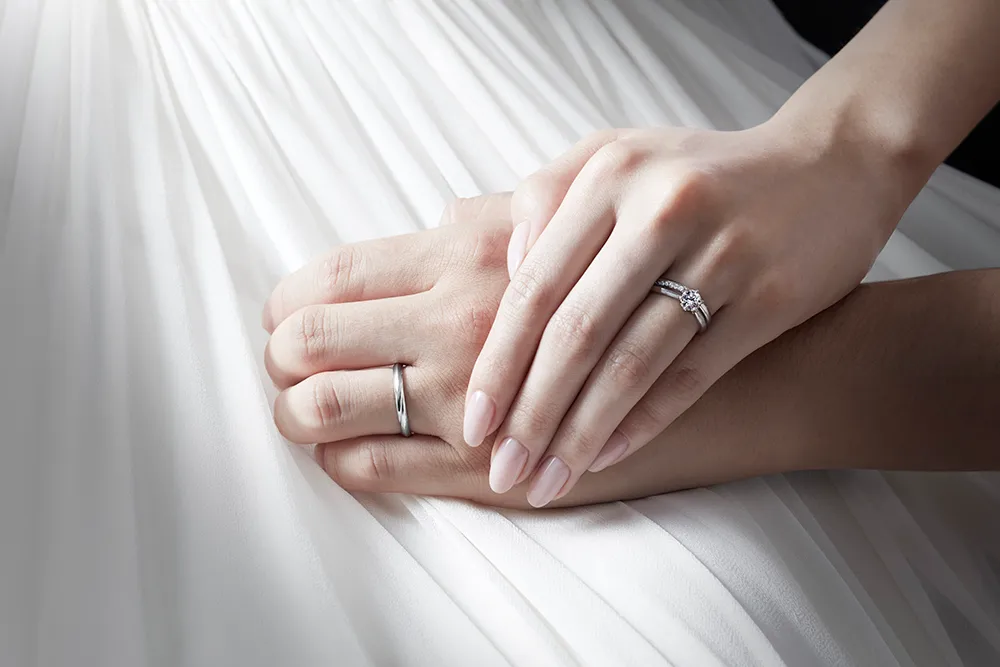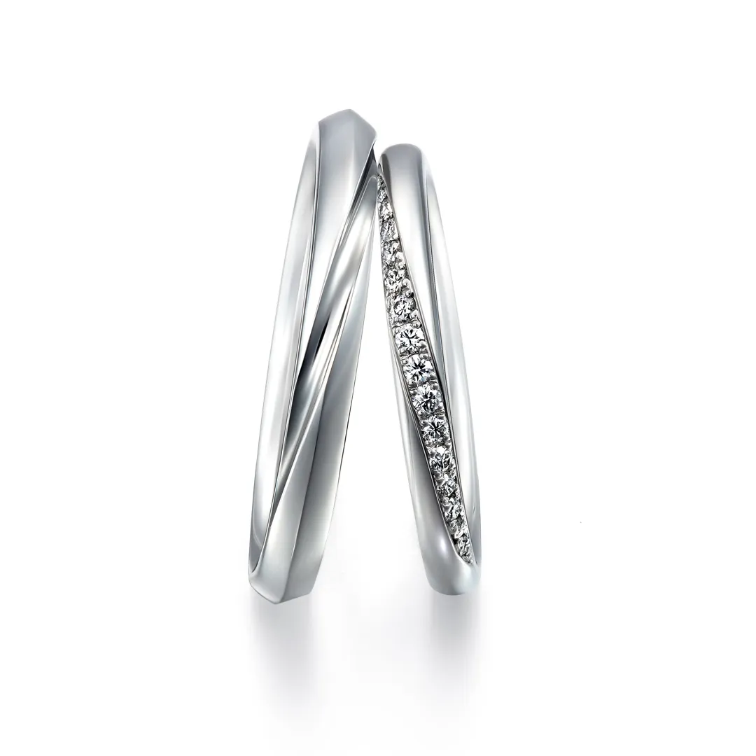 身に着けるたび、互いの心に力が宿る。凛々しいアームで「強さ」を、流れるようなメレダイヤモンドラインで「やさしさ」を表現した2本のリングを並べると、寄り添い、支えあいながらひとつの未来へと向かうおふたりの姿が浮かび上がります。