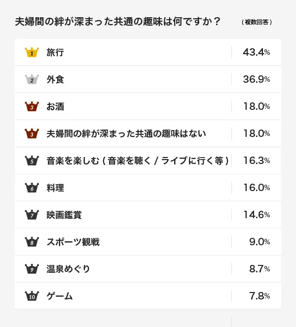 3位のお酒(18%)、2位の外食(36%)に大差をつけて堂々1位に輝いた夫婦共通の趣味とは…?