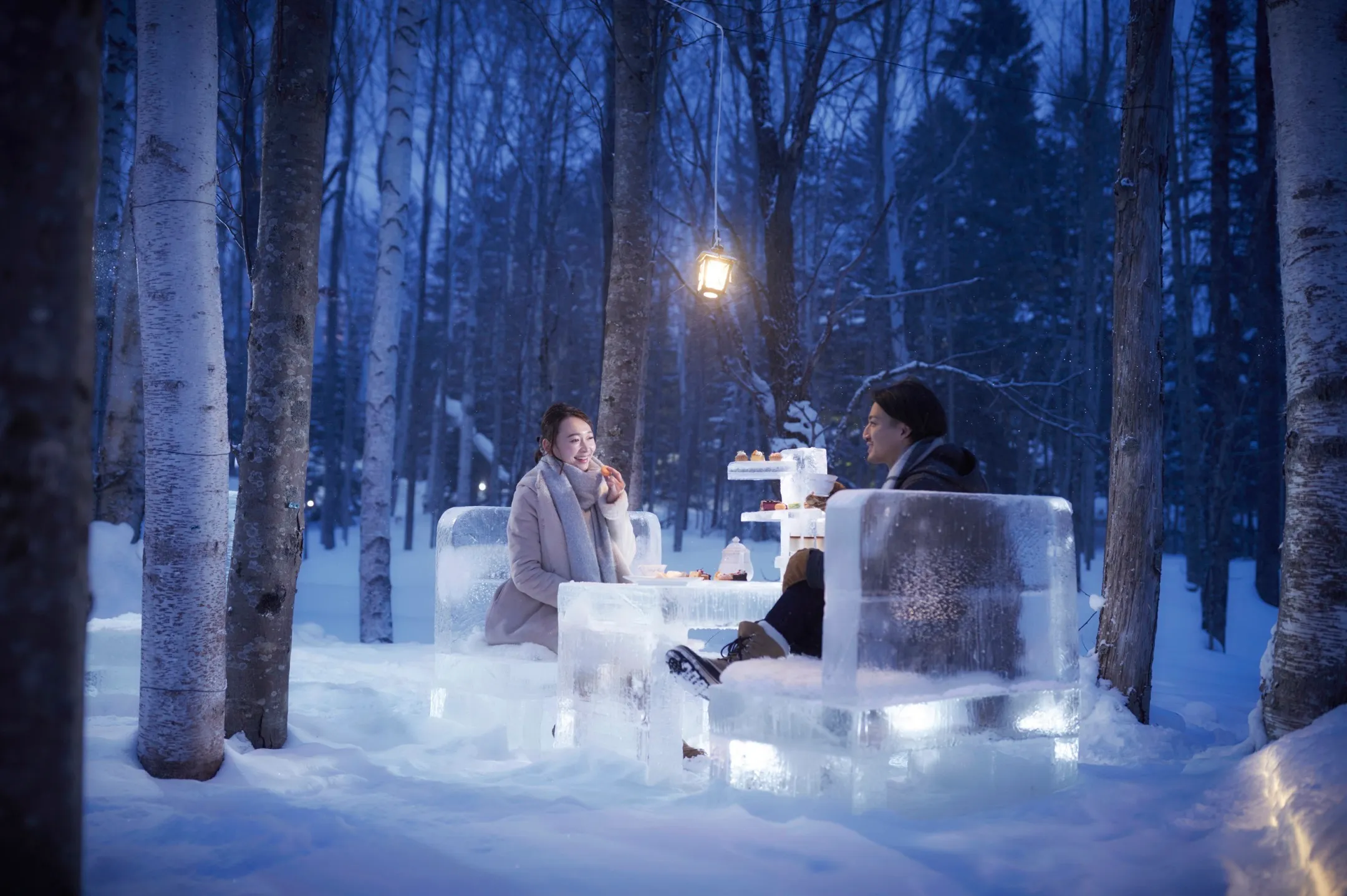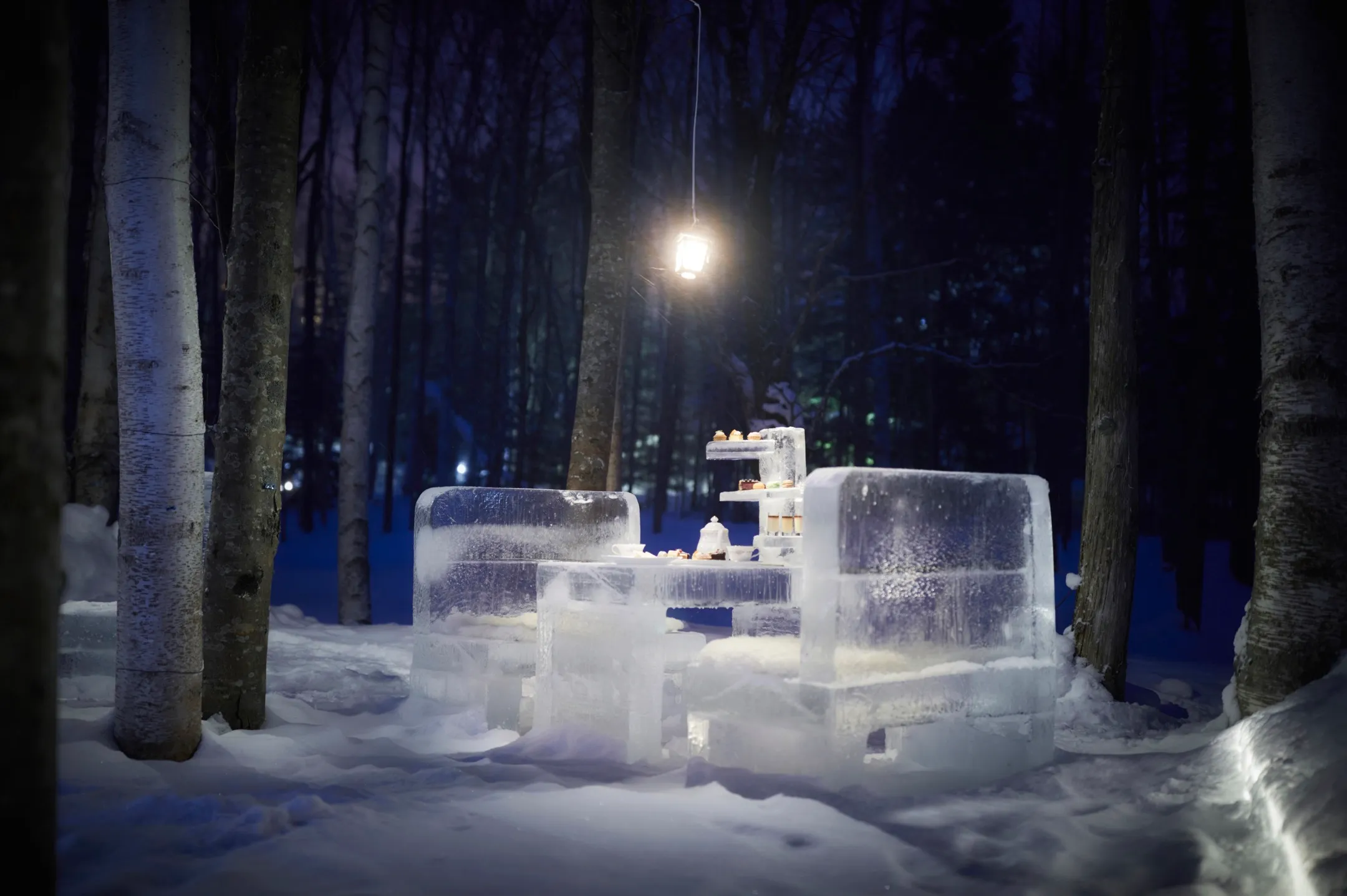 「氷の特別席」は氷の街「アイスヴィレッジ」内のライトアップされた白樺の森の中にあります。氷のティースタンドがセットされた机と椅子、全てが氷でできています。氷の幻想的な特別席は、都会では味わえないバレンタインを過ごすことができる空間です。