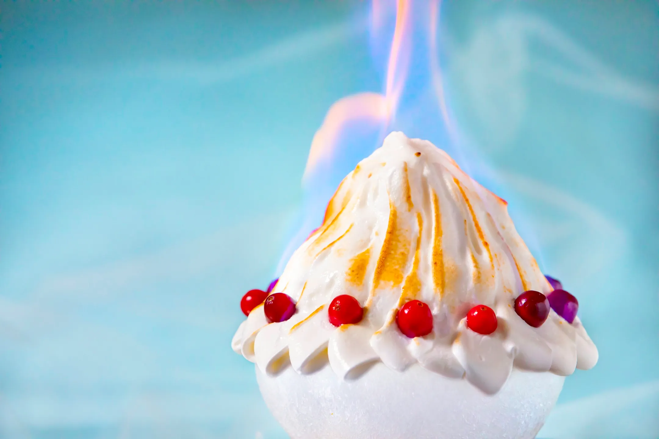 新メニューとしてスペシャリテ「チョコレート焼き氷」を提供します。彩り豊かなフルーツとミルクチョコレート味のかき氷をメレンゲで覆ったスイーツです。お客様の目の前で焼き氷に火を点けて提供するため、氷の空間に火が灯る瞬間は、非日常的です。炎の熱でメレンゲを焦がし、甘さに加えて香ばしく仕上げます。さらにこの焦げたメレンゲと、中身のフルーツとかき氷が絡み合うと、濃厚な味わいになります。幻想的な氷の空間で、バレンタインに華を添えるスイーツです。