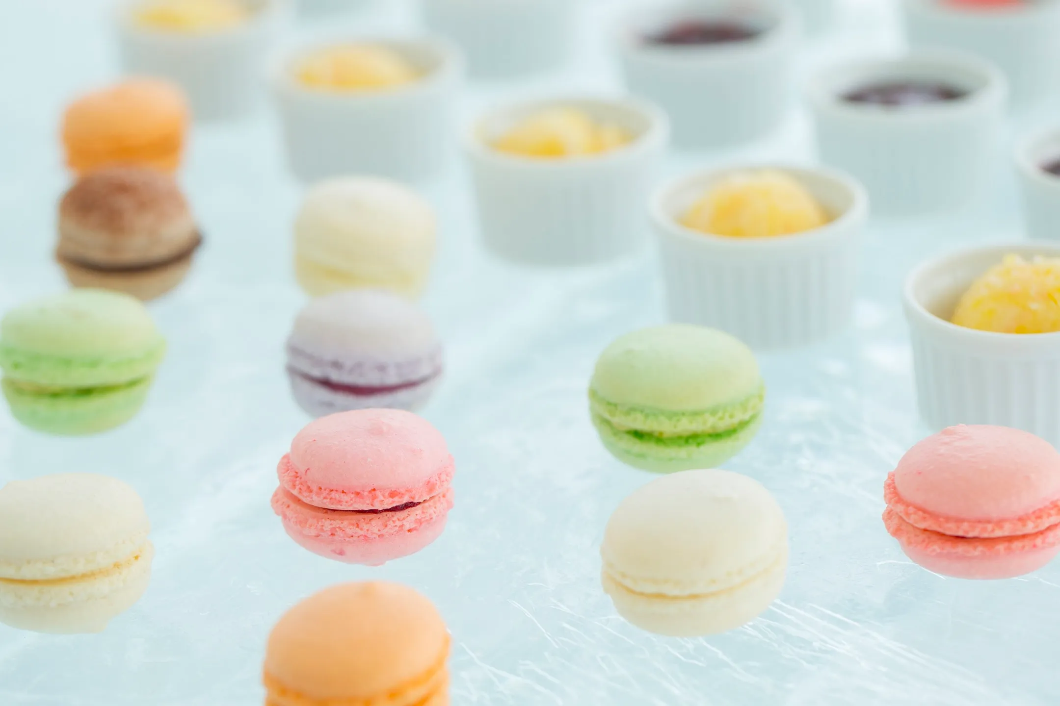 氷のテーブルには、氷でできた3段のティースタンドを設置し、ケーキやマカロンなど5種類の小菓子「アイスプティフール」を用意します。ピンク色や青色など彩り豊かな小菓子を並べるため、透明感のある氷の上で色合いが映え、見た目が可愛らしく目でも楽しめます。
