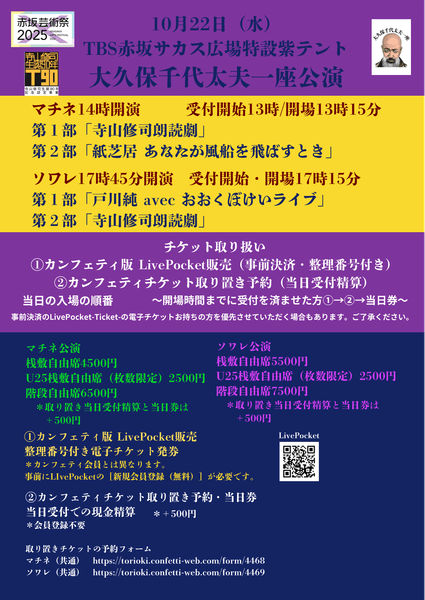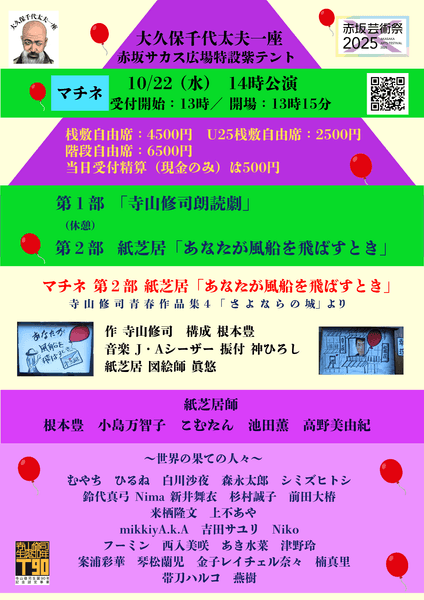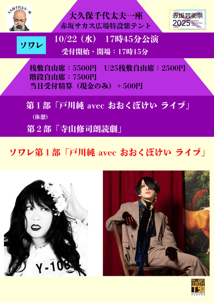 赤坂芸術祭2025 大久保千代太夫一座公演『寺山修司生誕90&唐十郎生誕85 大記念祭』が2025年10月22日 (水)に赤坂サカス広場 特設紫テント(東京都港区赤坂5丁目3-6)にて上演されます。