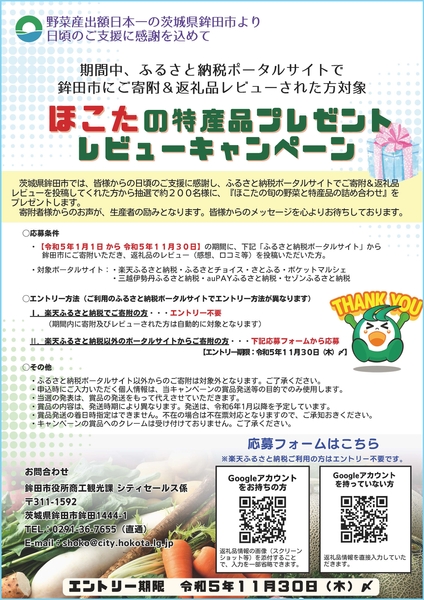 鉾田市では、令和5年11月30日までの期間、下記ふるさと納税ポータルサイトで鉾田市にご寄附いただき、返礼品のレビューをしていただいた方から抽選で約200名様に、鉾田市の特産品詰め合わせをプレゼントします。